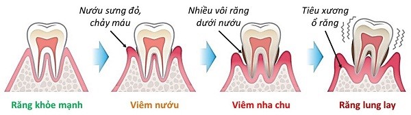 Giai đoạn đầu là viêm nướu, gây đau nhức, sưng phù nướu, sau đó bệnh âm thầm phát triển và thể hiện những dấu hiệu rõ rệt: